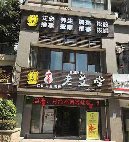 老艾堂艾灸加盟全国统一门头以褐色为背景色,白色、暖黄色为字体色,彰显中华老艾堂的logo及刚劲有力的白色字体“中华老艾堂”,以艾灸、理疗、养生、刮痧、松筋为主打, 醒目,店面门头是由老艾堂 设计团队精心打造。